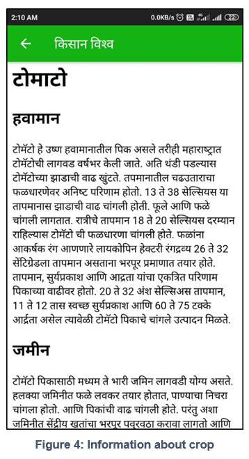 The KisanVishwa application serves as an invaluable repository of information, offering users access to a diverse range of agricultural technologies and insights into the challenges tied to crop growth, as illustrated in Figure 1. This universal accessibility ensures that every user of the system is equipped with the essential knowledge required for informed decision-making in agricultural practices.