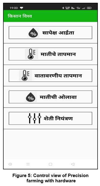 To configure app in Real-time required sensor based hardware to be in syncronisation and configuration, visualization, and Control: KisanVishwa’s integrated cloud infrastructure gives hardware users real-time control over farm parameters. The AWS EC2 cloud architecture is scalable and portable. Apps features are shown in Figure 5. Real-time Farm Control: With precision agriculture hardware in the field, users can remotely control actuators and collect field data through the app. The smart control page let farmers control actuators via the cloud. Data Visualization of Farm Field Parameters: The app displays real-time data and its fluctuations for different constraints. The results page that was developed within the app and is displayed in Figure 4 provides information about the cultivation of crops as well as the essential conditions that are specific to each crop. which would be of great assistance to farmers if they knew the precise constraints that are required fo r a particular crop.