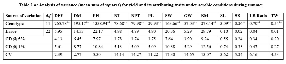 Table 2A: Analysis of variance (mean sum of squares) for yield and its attributing traits under aerobic conditions during summer |