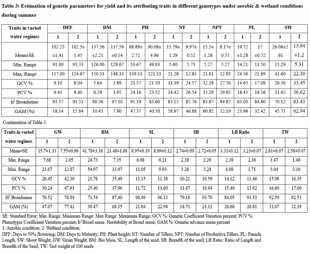 Table 3: Estimation of genetic parameters for yield and its attributing traits in different genotypes under aerobic & wetland conditions during summer. |