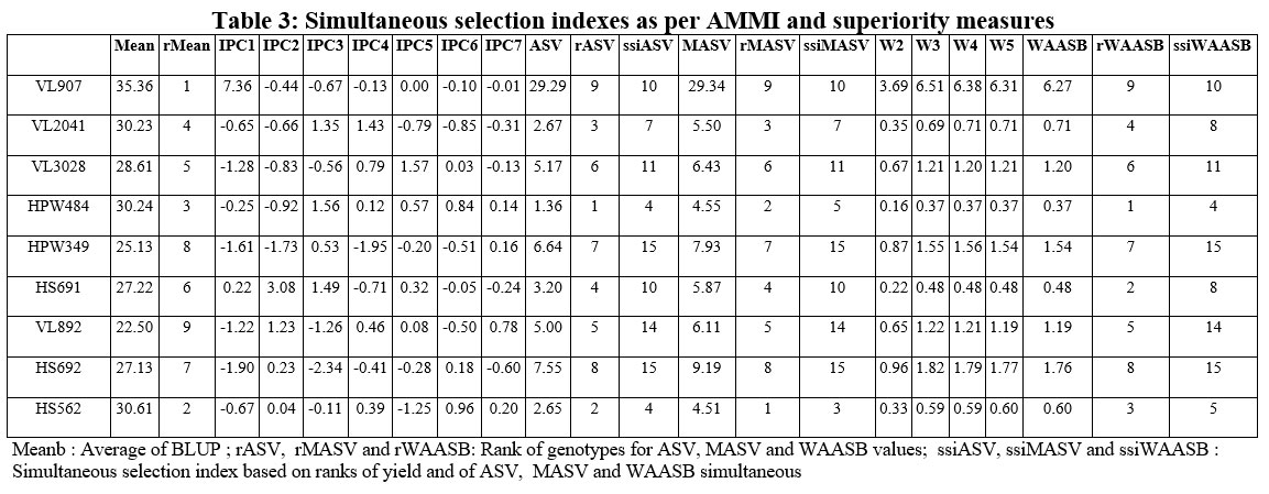 Table 3: Simultaneous selection indexes as per AMMI and superiority measures.