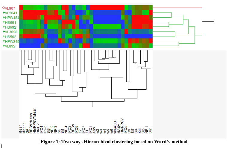 The advantage of two ways hierarchical cluster analysis, based on genotypes and various measures has been discussed. By dividing genotypes and measures into homogeneous groups, interactions within groups would be minimized as mentioned by Mostafavi and Saremirad, 2021. Multivariate hierarchical clustering of evaluated and considered measures had been carried out as per Ward’s method as similar performers were grouped together in same group (Khalid et al. 2023).  One genotype VL907 was placed in separate group and others performed in similar fashion as per considered measures of this study. Measure Interaction principal component IPC1 had divided others in two groups at the first node of bifurcation. ASV, MASV, WAASB, HMPRGV, non parametric measures along with composite non parametric measure were placed together while analytic measure as per BLUP of genotypes i.e. Meanb, GAI, HMGV, RPGV, HMGV*Meanb, RPGV*Meanb, interaction principal components IPC2, IPC3, IPC4, IPC5, IPC6, IPC7, non parametric measures along with composite non parametric. Further at the second node of classification the measures in first group had been further in five clusters while the measures of bigger group had partitioned into seven clusters.