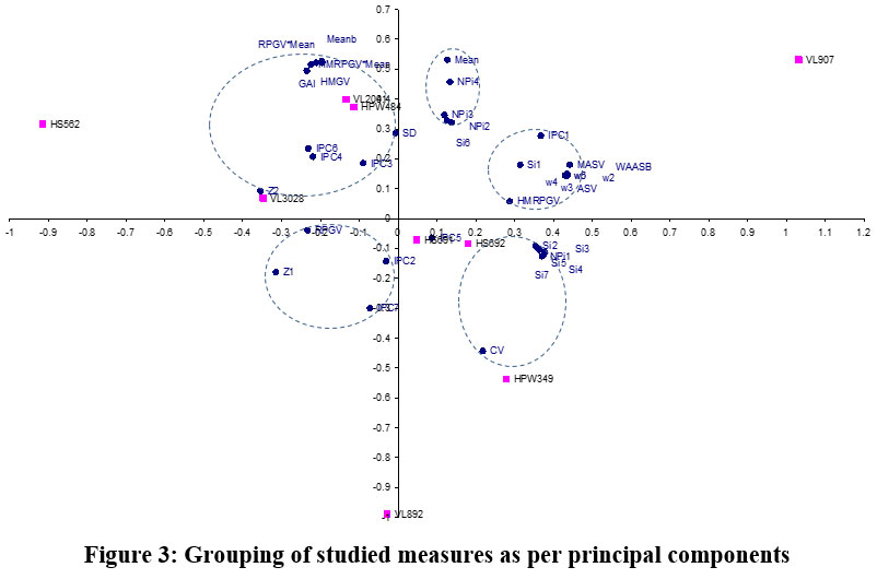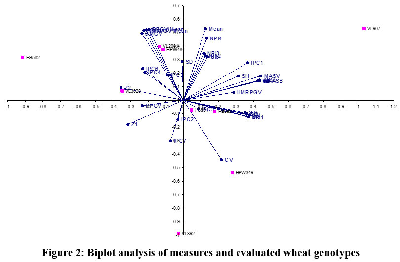 First two significant components had accounted for 55.5% of the total variation among the evaluated genotypes and considered measures in the study (Table 5). Respective share of these components were 30.5% and 25% whereas the MASV, ASV, WAASB were major contributors for the first while the more share had augmented by RPGV*Mean, Mean, Meanb, GAI, HMRPGV*Mean, NPi(4) for second one. Wheat genotypes VL907, HS562 and VL892 VL907 had more contributions in respective components.
