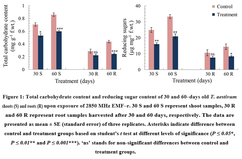 Figure 1: Total carbohydrate content and reducing sugar content of 30 and 60‒days old T. aestivum shoots (S) and roots (R) upon exposure of 2850 MHz EMF‒r.