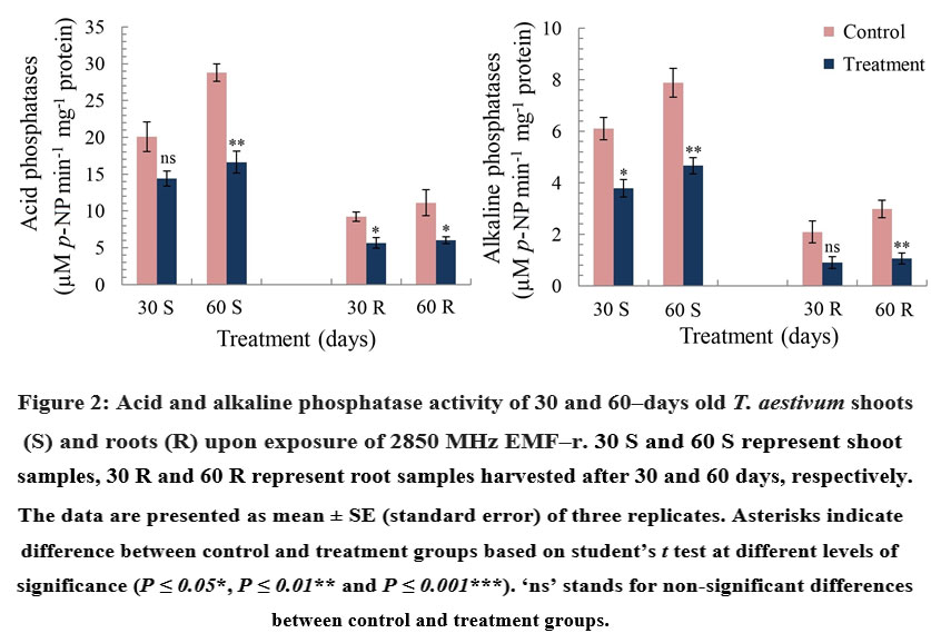 Figure 2: Acid and alkaline phosphatase activity of 30 and 60‒days old T. aestivum shoots (S) and roots (R) upon exposure of 2850 MHz EMF‒r.