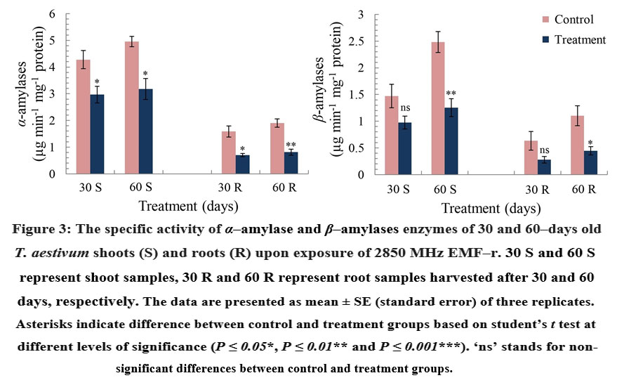 Figure 3: The specific activity of α‒amylase and β‒amylases enzymes of 30 and 60‒days old T. aestivum shoots (S) and roots (R) upon exposure of 2850 MHz EMF‒r.