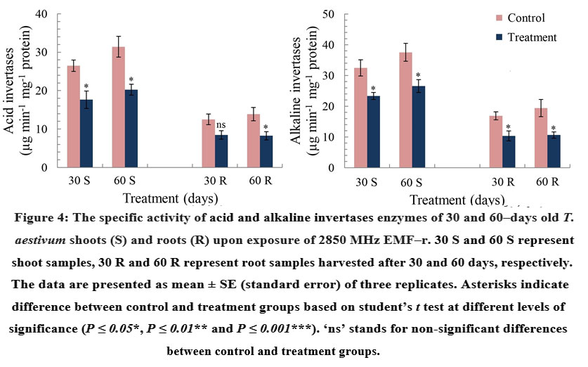 Figure 4: The specific activity of acid and alkaline invertases enzymes of 30 and 60‒days old T. aestivum shoots (S) and roots (R) upon exposure of 2850 MHz EMF‒r.