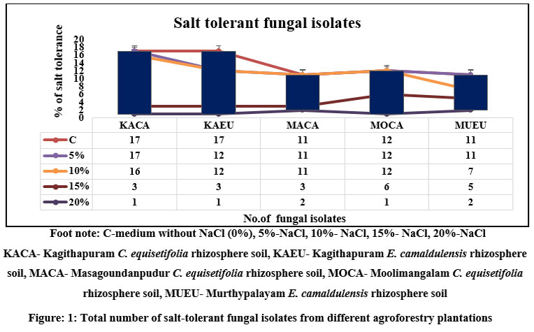 In this study, we aimed to isolate and identify the native salt-tolerant PGPF from agroforestry plantations in saline soils at different study sites. However, there was only limited data on the presence of free-living rhizosphere soil fungi. We isolated five promising salt-tolerant PGPF and evaluated the possibility of their application as potential bioinoculants that could be cost-effective, more economical than the application of synthetic chemical fertilizers. Once these stress-tolerant bio-inoculants are established in the roots of selected tree seedlings, they can further multiply in the roots and supply the essential nutrients to the host plants in the salt-affected areas; in addition, they can help plants survive better in stressed areas. This study provides valuable insights into the diversity status of salt-tolerant fungal species from agroforestry areas in Karur district; however, it has certain limitations associated with sample collection. The samples were collected only from one particular district and the sample size was small. These limitations highlight the need for further research using a larger sample size to enhance the validity and generalizability of the findings. By addressing these limitations, future studies can contribute to a more comprehensive understanding of the large diversity of fungal isolates and their PGP activity.