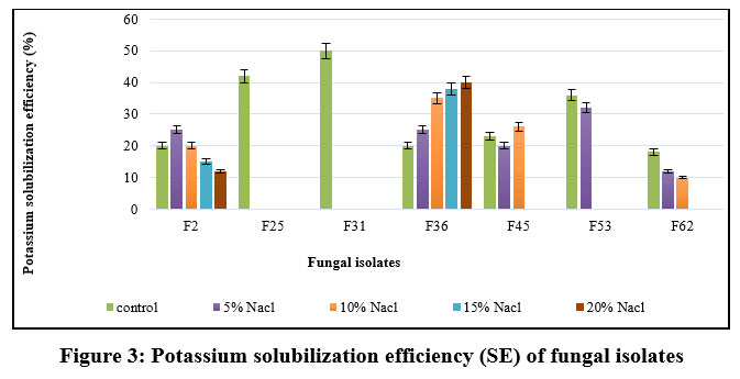 Nitrogen fixation was tested by inoculating selected fungal isolates on plates of N-free agar medium incorporated with different concentration of NaCl (0% (control), 5%, 10%, 15%, and 20%) and incubating the plates for 7 days at 28°C with 3 replicates. The isolates growing after repeated inoculation in N-free medium were considered to be positive for nitrogen fixation.20