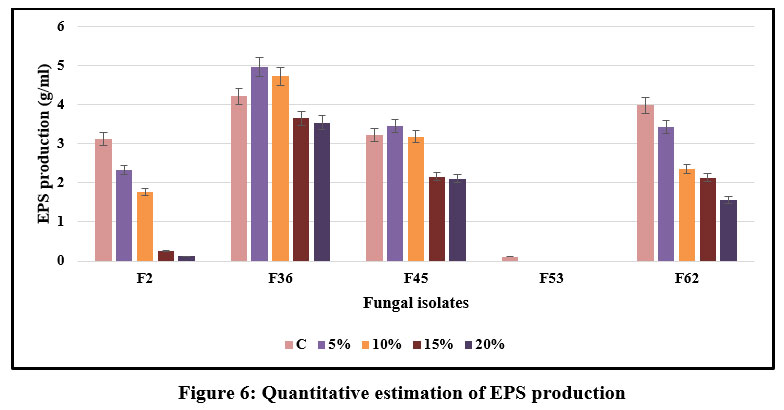 EPS production was screened, as described by Ruhmann.26 Selected isolates were inoculated into 10 ml basal medium with different concentrations of NaCl (0%, 5%, 10%, 15%, and 20%) and incubated at room temperature for 5−6 days; 10 ml of culture suspension was collected and centrifuged at 3000 rpm for 15 min. Thrice the volume of chilled acetone was added to the supernatant. EPS was separated from the mixture in the form of a slimy precipitate; it was collected on a pre-dried filter paper, and the precipitates were allowed to dry overnight at 50°C. The dried filter paper was reweighed after overnight drying.