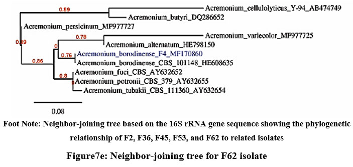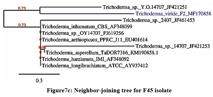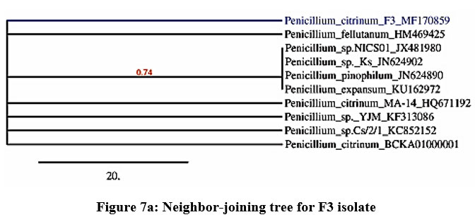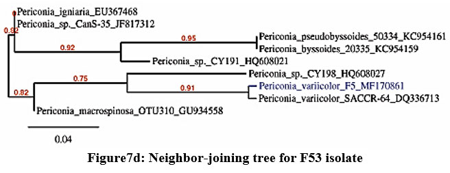 The 18S rRNA gene sequence analysis was performed for selected PGPF. DNA isolation was performed by using the EXpure Microbial DNA isolation kit developed by Bogar Bio Bee stores Pvt Ltd, Coimbatore, Tamil Nadu. Sanger’s di-deoxy nucleotide sequencing method was employed for the gene sequencing. Subsequently, a similarity search for the generated sequence was executed using the National Centre of Biotechnology Information (NCBI) with the help of BLAST program. The resulting sequences were deposited into the GenBank nucleotide database, and accession numbers were acquired.  Following the retrieval of blast results, a phylogenetic analysis of the query sequence was conducted, which was subsequently followed by multiple sequence alignment with closely related sequences. Then the construction of the phylogenetic tree was accomplished using the Neighbour-joining (NJ) method.