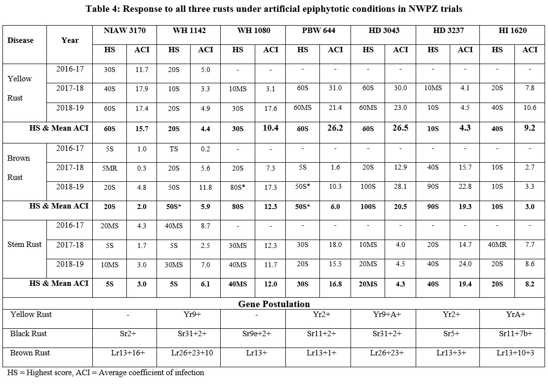 Table 4: Response to all three rusts under artificial epiphytotic conditions in NWPZ trials. |