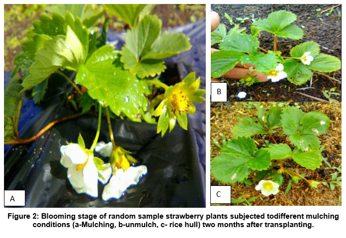 Figure 2: Blooming stage of random sample strawberry plants subjected to different mulching conditions (a-Mulching, b-unmulch, c- rice hull) two months after transplanting. |