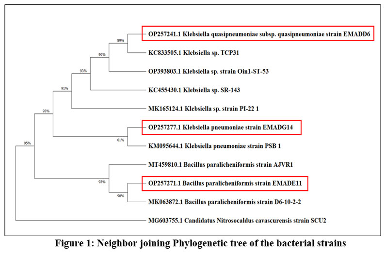 The molecular sequencing of the strains was done by Gujarat Biotechnology Research Centre where 16S rRNA sequences of the isolates were compared with sequences available in the BLAST tool in the NCBI database. Further, a phylogenetic dendrogram was constructed using the neighbor-joining method.