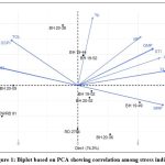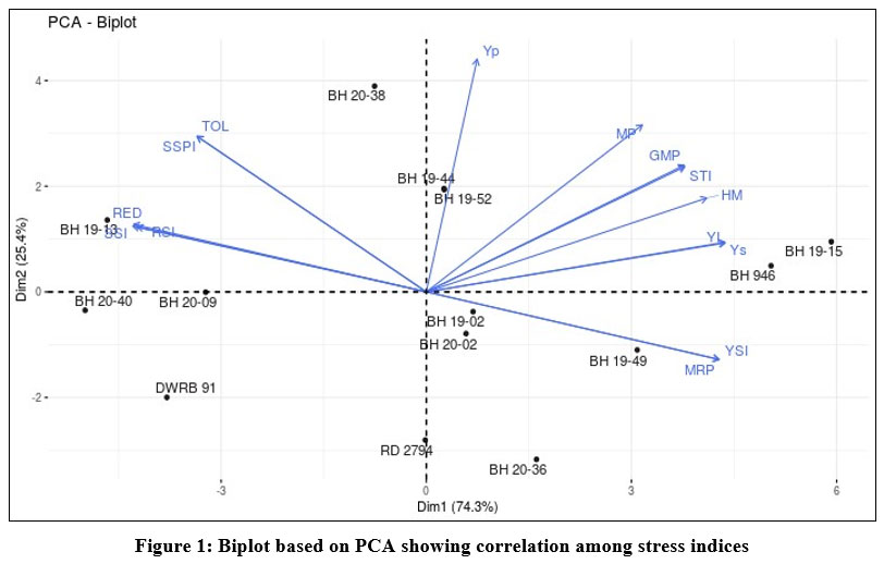 The traits viz., days to heading, days to maturity, plant height (cm), number of effective tillers per meter, spike length (cm), number of grains per spike, 1000-grain weight (g), biological yield (q/ha), harvest index (%), and grain yield (q/ha) were studied under both stress and non-stressed environments. The biological and grain yield were recorded on plot basis and converted in quintals per hectare (q/ha). The different stress indices used in the present study for salt tolerance are given in Table 1. The recorded data was subjected to statistical analysis using Microsoft Excel for calculation of stress indices. R studio version 2023.12.1.402 was used for correlation coefficient and cluster analysis. SPSS Statistics version 27 was exploited for Principal Component Analysis (PCA) and to draw the biplot diagram.