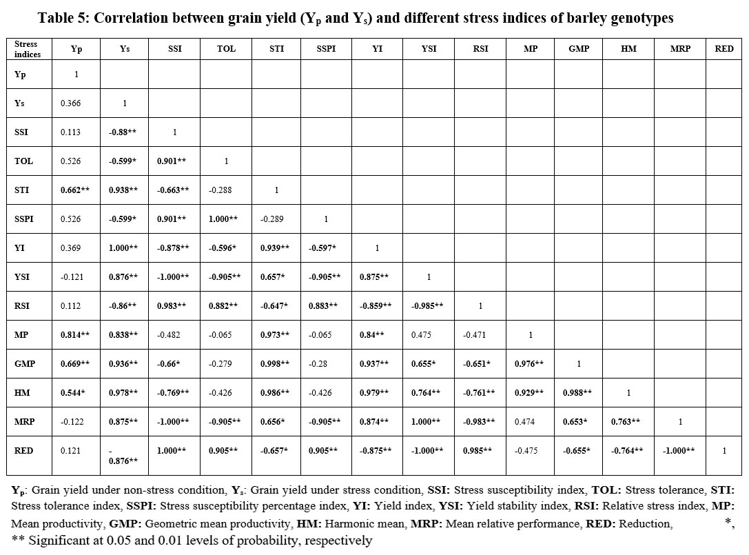 The average performance of genotypes in relation to grain yield (Yp and Ys) and stress indices under study is portrayed in Table 8. The observations indicated cluster I with minimum SSI, TOL, SSPI, RSI, and RED, and higher YI, YSI, MRP and Ys. Similarly, cluster II characterized by higher STI, MP, GMP, HM and Yp. Hence, genotypes from cluster I and II be considered as promising for stress and non-stress conditions, respectively. They may be utilized for furtherance of genetic gain in yield and other traits while stepping up barley breeding in stress and normal growing situations.