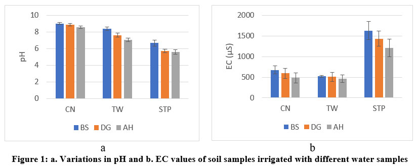 Figure 1: a. Variations in pH and b. EC values of soil samples irrigated with different water samples