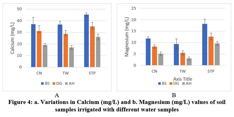 Figure 4: a. Variations in Calcium (mg/L) and b. Magnesium (mg/L) values of soil samples irrigated with different water samples