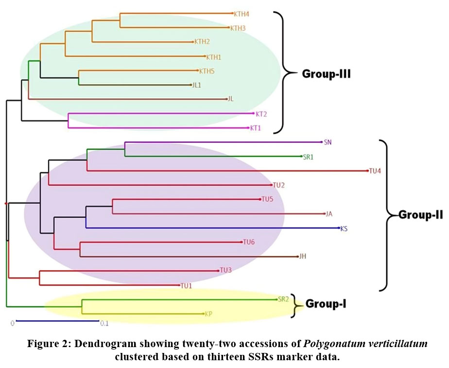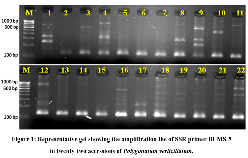 Polygonatum verticillatum L. is a highly valued medicinal herb of Indian Himalayan region (IHR) and occurs from 2000 -3000 m asl. It is a member of family Asparagaceae. It is known as “Meda” in Sanskrit and “Salam Mishri” in Hindi. This herb yield important metabolites and is one of the constituents of many ayurvedic formulations1-3. Morphologically, plants are slender and generally, unbranched with leaves arranged in verticillaster manner. Leaves are lanceolate, and stem bear flowers near the base of leaves. Flower colour is generally pale yellow and greenish. The fruits are round berries that are initially green in colour and become red when ripe. It is a plant of high importance. However, unscientific exploitation by local traders and anthropogenic activities has resulted in habitat destruction of its natural populations, which has resulted in the loss of the different wild genetic stocks of this valuable plant species. It has been reported from Uttarakhand that plant is vulnerable due to overuse by pahemaceutical companies, less awareness about the plant among local people, habitat destruction and habitat fragmentation in addition to unscientific harvesting and other anthropogenic activities4,5. Hence, it is also listed in threatened plants category6,7. In this situation, supreme importance should be given for characterizing the existing germplasm at molecular level for its genetic diversity and conserving its diverse germplasm. Genetic diversity data can be useful in identifying the diverse accessions which can be selected for conservation and for breeding experiments on priority basis. Diversity data can also be used for better management of the germplasm. Further, molecular characterization should be carried out at genetic level to identify elite germplasm stocks. This will help maintain diverse germplasms in the future and consequently will help in their conservation and management. Molecular markers, specifically DNA markers, are the highly preferred for the genetic characterization of any type of germplasm and plant collection. There are various types of DNA markers such as RFLP, RAPD, AFLP, ISSR, SSR, and SNP. Of these, SSR markers are currently the most commonly used DNA markers due to their desirable features such as the potential to resolve heterozygosity, easy laboratory procedures, cross-transferable nature and evenness in genomes8-15. Hence, these markers are widely used in plant genetic diversity research.