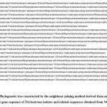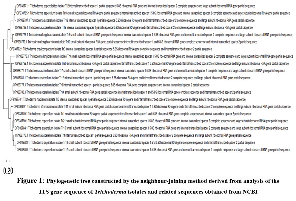 The ITS and tef sequences of the Trichoderma isolates were aligned with the reference sequences of Trichoderma obtained from NCBI database using Clustal W software Ver. 2.0 and MEGA software for phylogenetic tree construction.