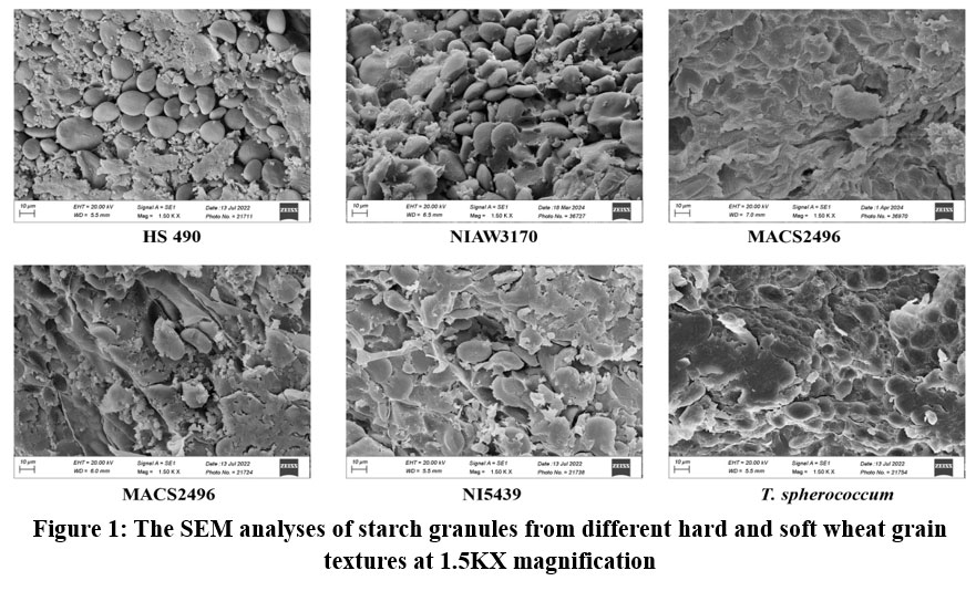 Figure 1: The SEM analyses of starch granules from different hard and soft wheat grain textures at 1.5KX magnification |