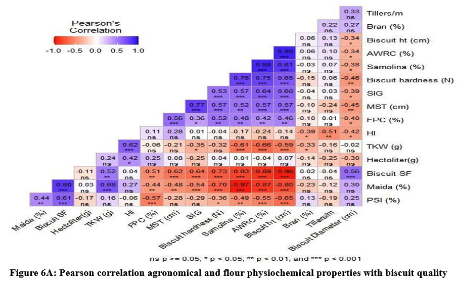 Figure 6A: Pearson correlation agronomical and flour physiochemical properties with biscuit quality |