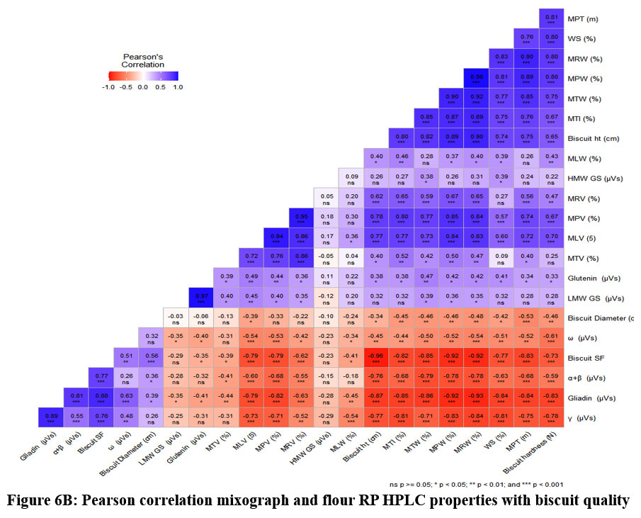 Figure 6B: Pearson correlation mixograph and flour RP HPLC properties with biscuit quality |