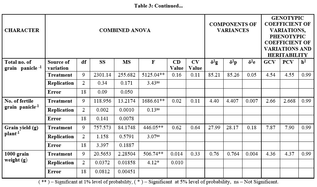 Table 3: Combined ANOVA for various metrical charactersClick here to view Table