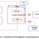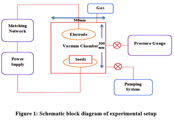 The maize seeds were pre-treated using a glow-discharge plasma production apparatus using Radio Frequency power supply. In figure 1 the system comprises a cylindrical cathode assembly with an electrode-equipped stainless steel vacuum chamber. For RF electric gas discharge, an automatic matching network and a 13.56 MHz with the capacity up to 600W RF power source are used. The system consists of a rotary pump that creates a rough vacuum of 10–2 mbar. Various types of gases are supplied to the chamber by using a mass flow controller. Seeds were placed in the vacuum chamber between the electrodes on a pedestal with the help of a specially designed seed holder. Fifty seeds were placed on the seed holder for each exposure to plasma. After placing the seeds inside the chamber, a vacuum of 3×10-2 mbar was created with the help of the rotary pump. Before delivering RF power to the electrodes, one of the gases (helium, hydrogen, argon, nitrogen, or oxygen) was fed into the chamber using a mass flow controller at a flow rate of 95 sccm. Seeds were treated with plasma for 4 minutes at 30 W. The energy level and the time of exposure were standardized, and dose response curves were obtained by varying energy levels and the time of exposure. The treated seeds were taken out of the chamber and stored in sealed plastic bags for use in the field.