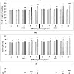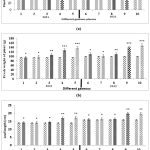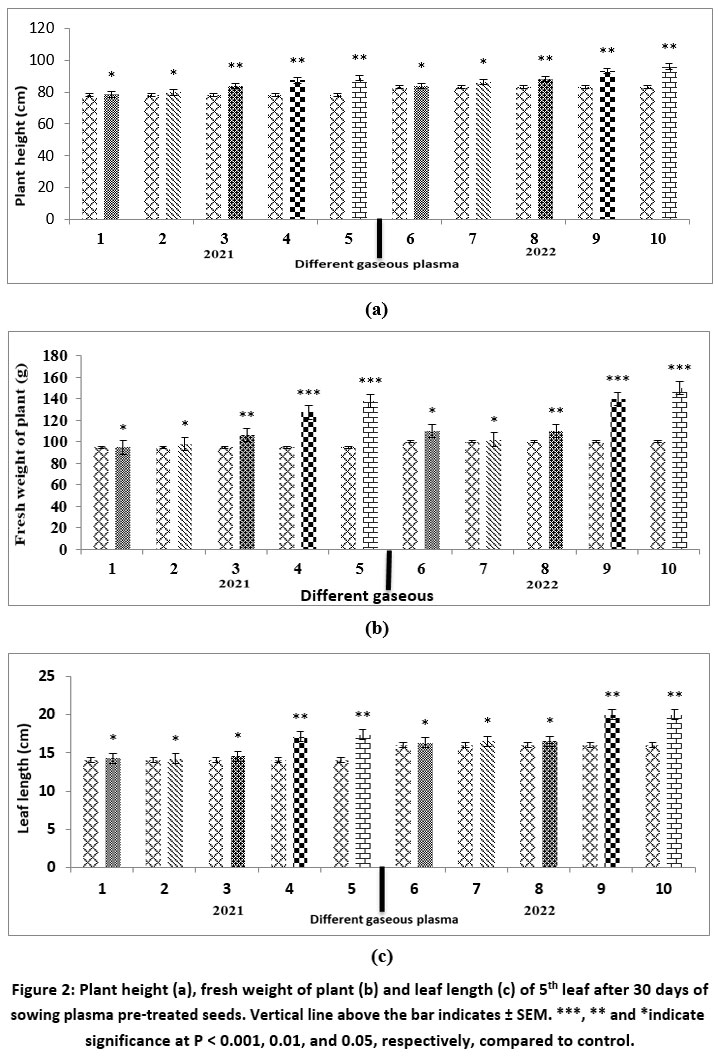Figure 2: Plant height (a), fresh weight of plant (b) and leaf length (c) of 5th leaf after 30 days of sowing plasma pre-treated seeds. Vertical line above the bar indicates ± SEM. |
