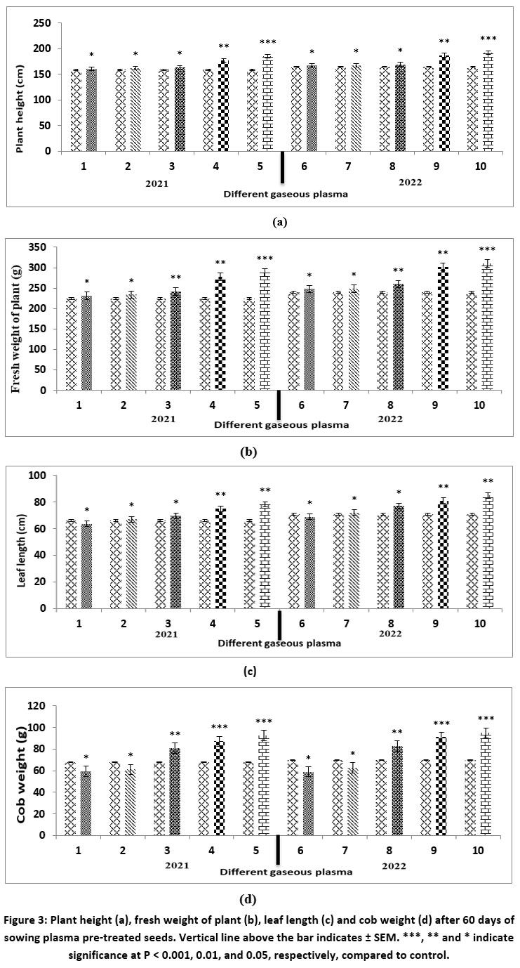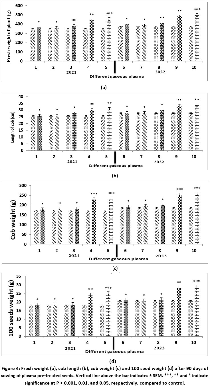 Table 3: Fresh weight, cob length, cob weight, and 100 seed weight after 90 days of sowing of plasma pre-treated seeds