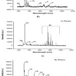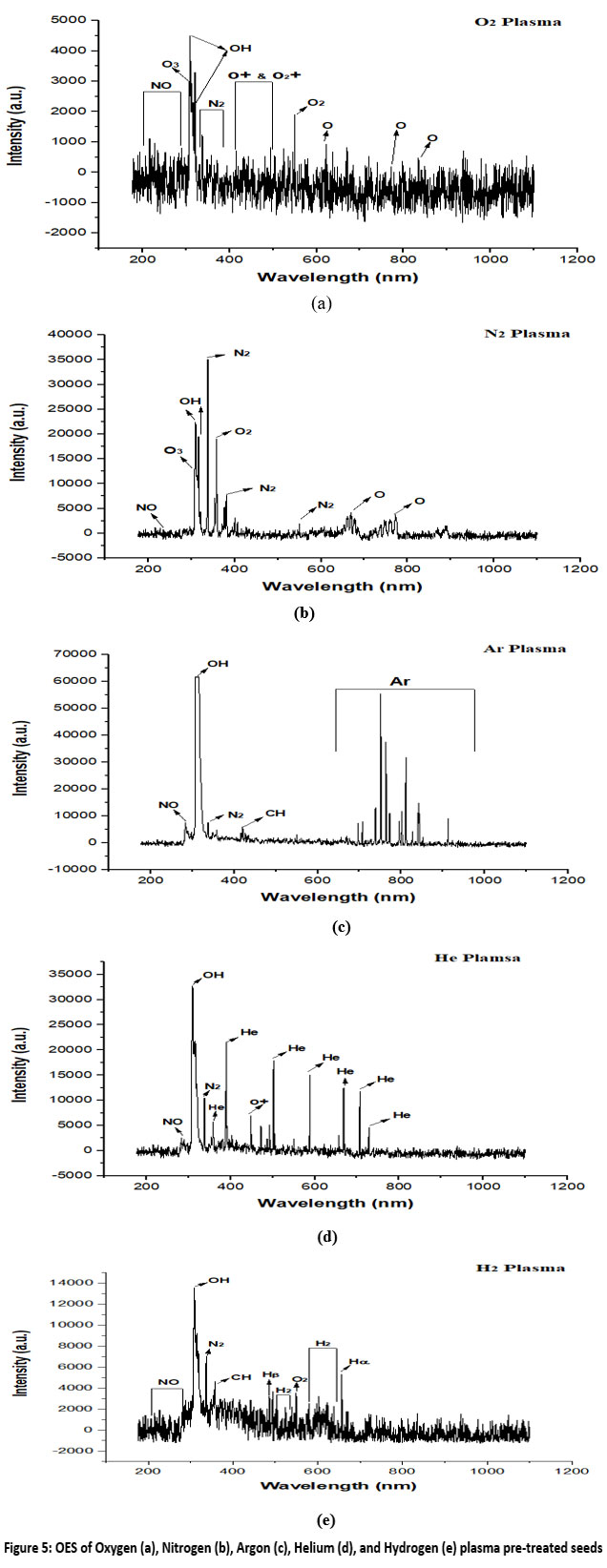 Figure 5: OES of Oxygen (a), Nitrogen (b), Argon (c), Helium (d), and Hydrogen (e) plasma pre-treated seeds |