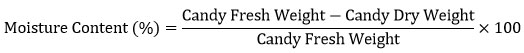 The moisture contents (MC) of candies were determined by measuring fresh weight which was based on a method given by the Hampton.24 Three replicates of each candy preparation were taken, and the fresh weight was determined using a calibrated balance with 0.1 mg accuracy. Following fresh weight determination, the candies were kept for drying at 96oC in the hot air oven for 48 h and then their dry weight was taken. The candy MC was expressed in percentage (%) by following the formula: