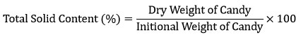 To determine the total solid (TS) content, the initial and dried weight of each candy sample was recorded before and after drying the samples at 96oC in the hot air oven for 48 h.25 The basic principle of this technique is that water has a lower boiling point than the other major components within foods, e.g., lipids, proteins, carbohydrates, and minerals. The total solids content is a measure of the amount of material remaining after all the water has been evaporated. The candy TS content was expressed in percentage (%) by following the formula: