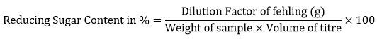 The determination of reducing sugar (RS) content in both Jaggery and Stevia candies was conducted by following a well-designed method with slight modifications.25,26 Upon candy preparation, 2 grams of each candy sample were homogenized in distilled water and subsequently centrifuged. The supernatant was then collected and diluted up to 5 times with distilled water for total sugar determination. In this process, 5 ml of concentrated HCl was added to 50 ml of each candy sample. The mixture was heated for approximately 10 minutes in a water bath, followed by the addition of 5 ml of concentrated NaOH to neutralize the solution. The solution was further diluted five times with 0.1 N NaOH solutions. In a separate conical flask, 5 ml of Fehling-A solution and 5 ml of Fehling-B solution were combined and heated for an additional 1-3 minutes. This solution was titrated against the sample solution until the appearance of yellow or red precipitation, with methylene blue used as an indicator. The endpoint for each sample was recorded and the reducing sugar content was calculated using the formula provided below and expressed as a percentage (%).