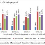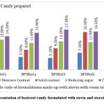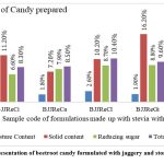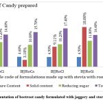 The reduction of moisture contents was again estimated at day 60 from all of the 20 formulations which were based on beetroot powder and juice with stevia and jaggery by both types of storage system where the first is room temperature and the second is refrigerator (Table 02). Where the former gave the values of 5.2%, 5.5%, 5.1%, 7.3% and 6.4% and later were recorded as 2.0%, 3.3%, 3.7%, 2.5% and 2.1%. Alternatively, the juice with jaggery with storage at room temperature was found as 3.9%, 4.6%, 4.5%, 4.5% and 3.6%. Whereas the formulation under refrigerator temperature was found as 1.9%, 1.8%, 2.6%, 1.9% and 2.3% respectively. Here the formulation with ginger at room temperature has been found better for candy.