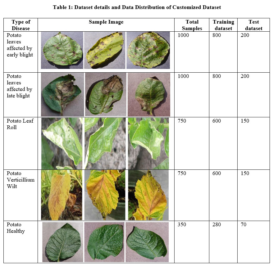 The implementation PotatoLeaf Insight System is conducted in python using Kera library. A hybrid dataset is used for training and testing of potato leaf disease. The hybrid dataset is combination of the Plant Village dataset17 and customized dataset prepared by using camera. Plant Village dataset is downloaded from Kaggle repository which consist of 54,306 images of both diseased and healthy plant leaves across 14 crop species. The customized dataset consists of images of leaf (Potato Verticillium_wilt and Leaf Roll).Table1 shows the customized dataset detail and data distribution consider in this work.