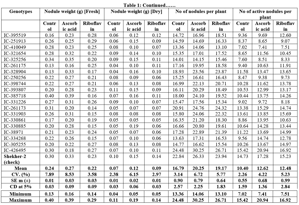 The average performance for the number of nodules per plant varied from 13.36 to 24.48 nodules for untreated control seeds; from 14.06-30.25 nodules for ascorbic acid treated seeds and from 13.10 to 26.71 nodules for riboflavin treated seeds. (Table 1) with a grand mean of 16.79, 20.25 and 19.17 nodules for control, Ascorbic acid treated, and riboflavin treated seeds respectively while