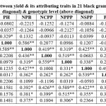 Table 3a: Correlation coefficient between yield and its attributing traits in 21 black gram genotypes at phenotypic level (below diagonal) and genotypic level (above diagonal). |