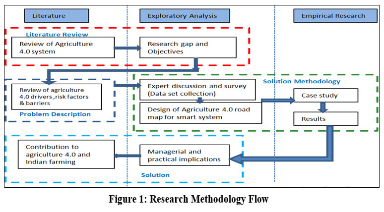 Using too many pesticides and fertilizers could result in a lower quality harvest production. As a result, soil nutrient monitoring is extremely difficult. Figure 1 illustrates the flow of the research methodology employed in the research. The literature review can be done by analyzing a few terms in conjunction with the amalgamation of IoT, Agriculture 4.0 – obstacles and hurdles, Agriculture 4.0, Implementation and endurance, Agriculture 4.0 Future, Smart agriculture system. For these terms Scopus and Google Scholar will be researched. Next, these keywords will be investigated in relation to the articles that have been collected. Furthermore, the gathered articles will be examined based on the challenges, barriers and future scope. This is how the literature review will be carried out in this study. The primary challenges will then be verified with the use of literature and expert opinion. The theoretical framework will be laid by these challenges. A case study and questionnaire-based survey will be conducted for the agriculture industry. Then the review of Agriculture 4.0 drivers, enablers, risk factors and barriers analysis are to be done. With the help of the above review and literature survey the research scope and problem definition is designed. In order to prepare the data for analysis in Agriculture 4.0, particularly in soil testing where precise and trustworthy data is critical, requires careful consideration throughout the second phase of exploratory analysis. Data transformation, data reduction, and data purification are just a few of the important steps in the process.