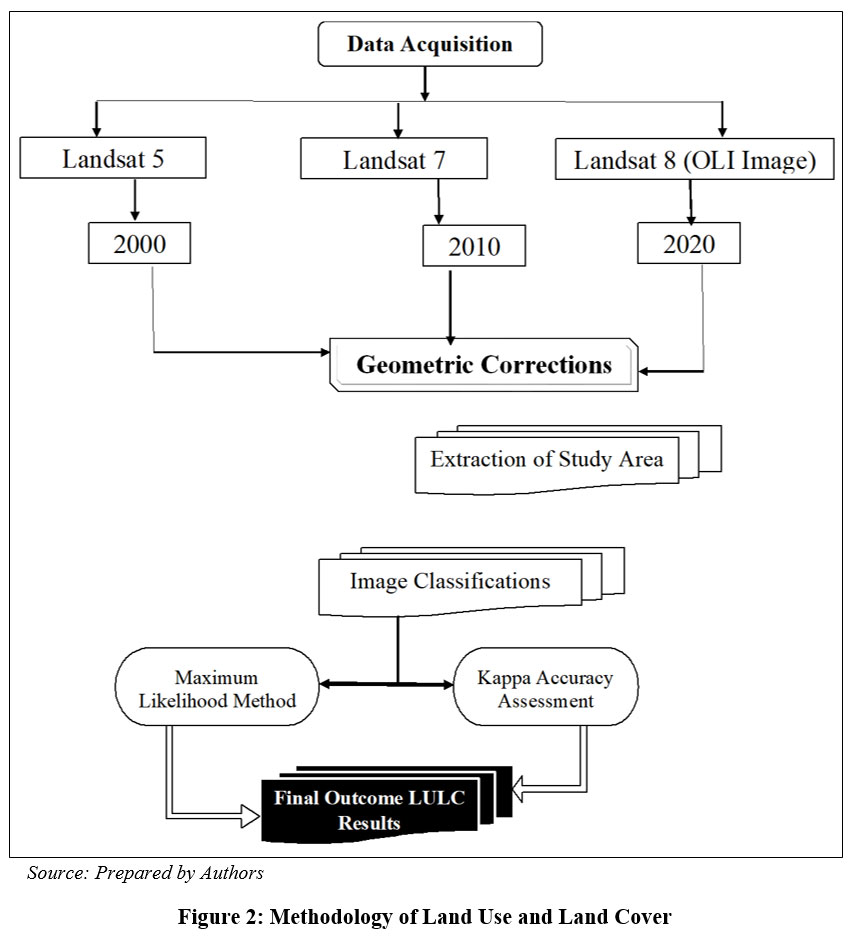 Changes in land use and land cover are the result of human exploitation of resources for varied purposes over time and space. These modifications may also be the result of natural processes. To understand the human interference in the natural pattern this method becomes relevant or viable to trace various feature that have been changed.1 The information of the area of interest collected through optical satellite imageries provides us an edge to understand the human activities and its utilization of the space for various purposes.2 The different uses of land are result of interaction among several factors of that region such as physical, social, economic and institutional.3 Land has been used for agriculture, forestry, recreational activities, industries, urbanization, grazing, etc. Land use change always occurs under certain circumstances and these circumstances affect the whole ecosystem of that region.4 The variables responsible for changes in land use and land cover can be divided into direct and indirect factors. Some activities or circumstances, such as agricultural development, industrialization, urbanization, etc. are known to directly affect or alter the proportion of land that is utilized.5 Physically, the direct variables are more significant than the indirect elements, but the indirect factors are responsible for affecting the direct factors, resulting in landscape changes.6 These indirect influences have extremely intricate structures that govern the transformation of land use and human activities. Population growth and economic shifts frequently influence land usage and land cover changes.7 Changes in land cover are mostly influenced by human activity.8 Changes in land use and land cover are complementary to one another.