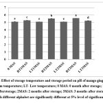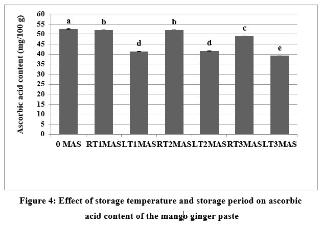 Figure 4: Effect of storage temperature and storage period on ascorbic acid content of the mango ginger pasteClick here to view Figure |