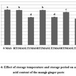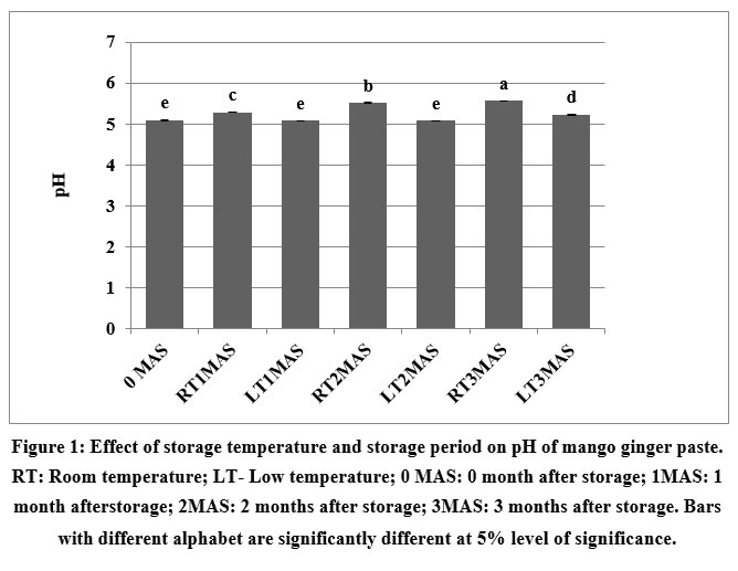 Figure 1: Effect of storage temperature and storage period on pH of mango ginger paste. RT: Room temperature; LT- Low temperature; 0 MAS: 0 month after storage; 1MAS: 1 month after storage; 2MAS: 2 months after storage; 3MAS: 3 months after storage.Click here to view Figure |