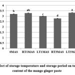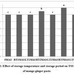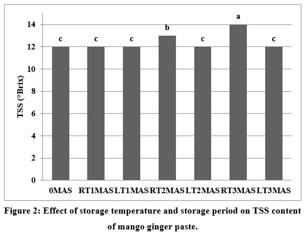 Figure 2: Effect of storage temperature and storage period on TSS content of mango ginger paste.Click here to view Figure |
