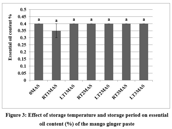 Figure 3: Effect of storage temperature and storage period on essential oil content (%) of the mango ginger pasteClick here to view Figure |