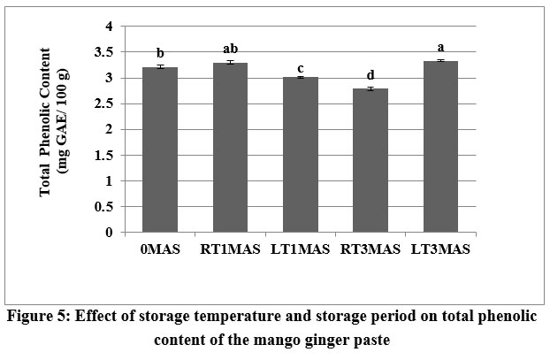 Figure 5: Effect of storage temperature and storage period on total phenolic content of the mango ginger pasteClick here to view Figure |