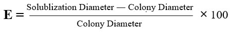 The selected isolates were introduced as spots in the middle of the Pikovaskayas medium and kept in an incubator at a temperature of 30°C for a duration of 7 days. The presence of a distinct transparent area signifies a positive outcome for phosphate solubilization, as stated by Nautiyal.13 Phosphate solubilization efficiency was calculated by,