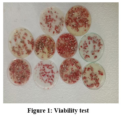 For germination assessment, four sets of 100 seeds each were randomly selected from the seed samples. These seeds were placed on germination paper with uniform spacing, rolled, and positioned vertically in a seed germinator cabinet maintained at a constant temperature of 25°C and a relative humidity of 95.0%. On the seventh day, the germination percentage was calculated, incorporating normal seedlings, aberrant seedlings, hard seeds, fresh ungerminated seeds, and dead seeds. The germination rate was expressed as a percentage.