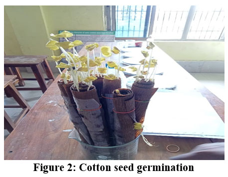 Seven cotton seed samples were assessed for germination using the between-paper method. Notable variations in normal seedling development were identified among the cotton genotypes collected from RRTTS Bhawanipatna. Germination percentages ranged from 52.33% to 77.00%. The highest germination percentage was recorded in V1 (77.00%), followed by V7 (73.00%), V2 (70.00%), and V4 (69.00%). In contrast, lower germination rates were observed in V5 (52.33%), V3 (67.66%), and V4 (69.00%). Only V1 among the genotypes met the minimum seed certification standards (65.0%) specified for cotton seeds. The variation in germination rates may be attributed to the genetic makeup of each genotype and environmental effects during production, harvesting, packaging, and storage. Germination appears to be a biological process influenced by various factors, including the distinct behavior of different genotypes. A wide range of differences in standard germination percentage in okra seeds13, while 14 observed similar variations in cotton genotypes.