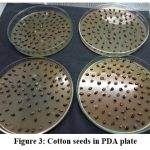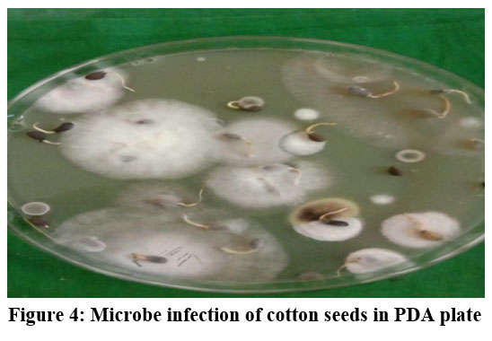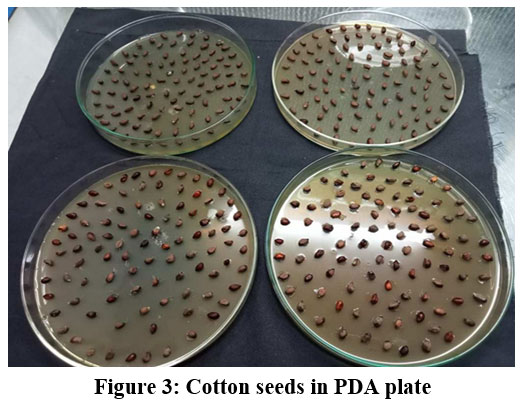 The pathogen was obtained from seeds gathered at the AICRP on Cotton Bhawanipatna through the following steps. Initially, the samples underwent washing with distilled water to eliminate foreign materials. Cotton seeds were then subjected to a 0.1% mercuric chloride solution for 2 minutes, followed by three thorough washes with sterile water to remove any residual mercuric chloride. Subsequently, the aseptically handled cotton seeds were placed in the center of Petri plates containing either host extracts or potato dextrose agar medium. The Petri plates were incubated at room temperature (25°C) for 7-10 days, resulting in the emergence of a pure fungal culture within 3-4 days post-inoculation.
